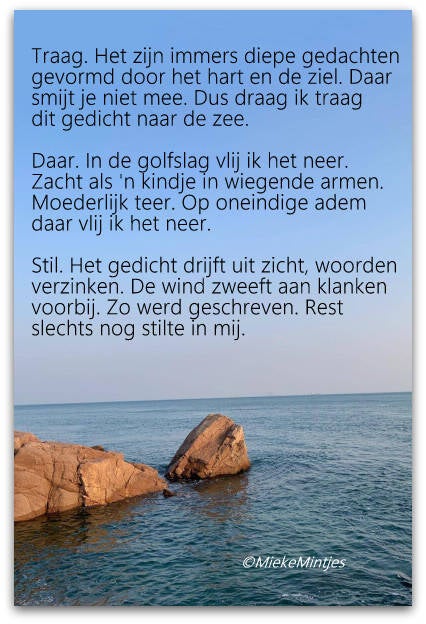 Dichten is echter mijn hoofddoel, omdat ik er hart en ziel in kwijt kan. Met behulp van Ai is het voor mij mogelijk geworden om dichtwerk om te zetten in gezongen gedichten. Kortgezegd ben ik mijn gedichten, mijn gedichten zijn wie ik ben. Meer werk lezen, luisteren of zien? Kijk dan op miekemintjes.nl of volg me op Facebook